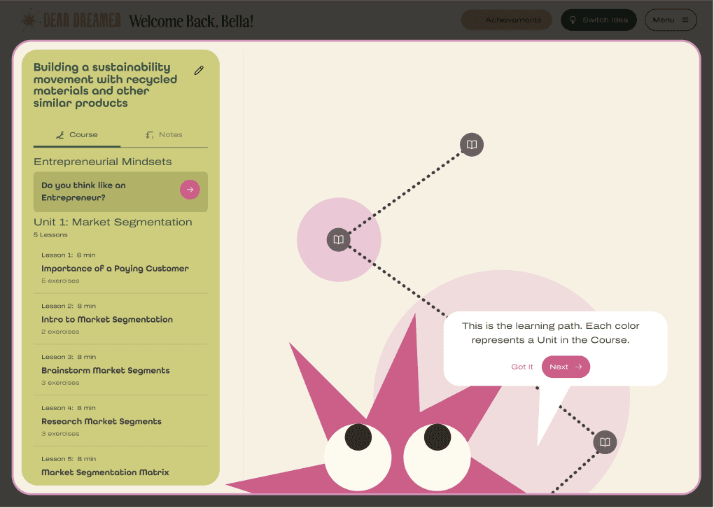 Dear Dreamer is a personalized entrepreneurship education platform for youth (ages 12–18, primarily young women) that teaches users how to start a business by actually starting one. Built on MIT's Disciplined Entrepreneurship framework and powered by Orbit's Jetpack AI. Created through a collaboration between the MIT Martin Trust Center for MIT Entrepreneurship and Frank & Eileen, the women's clothing brand founded by Audrey McLoghlin.